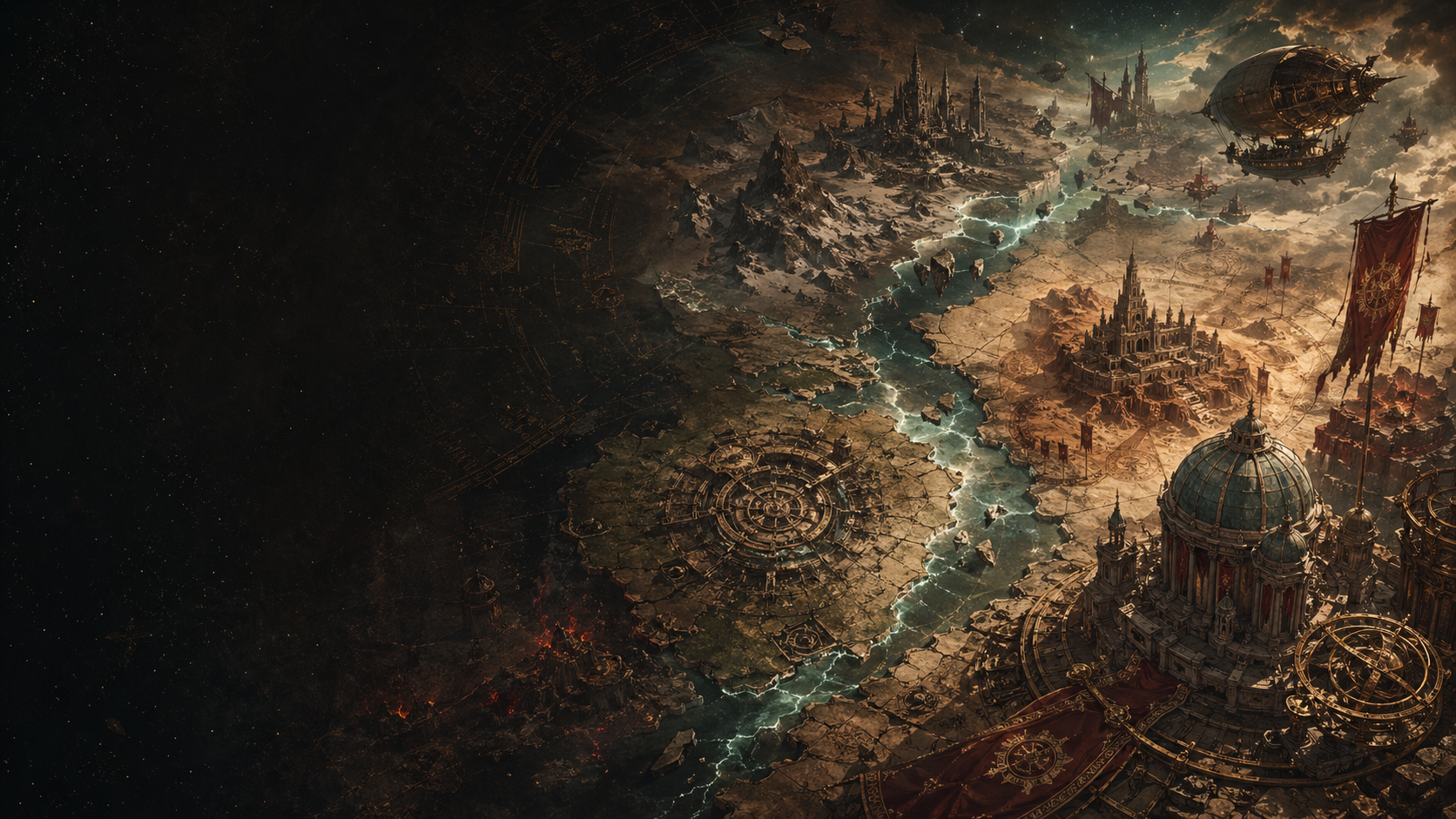 By the core era, roughly Year 1800 after Impact, societies have rebuilt as mythic-industrial echoes of old powers. The Book of Empires may be relic, religion, propaganda, alien code, or simply humanity repeating old structures.